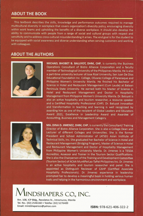 Multicultural diversity in workplace for the tourism professional / Michael Bhobet B. Baluyot, Ma. Dina D. Jimenez.